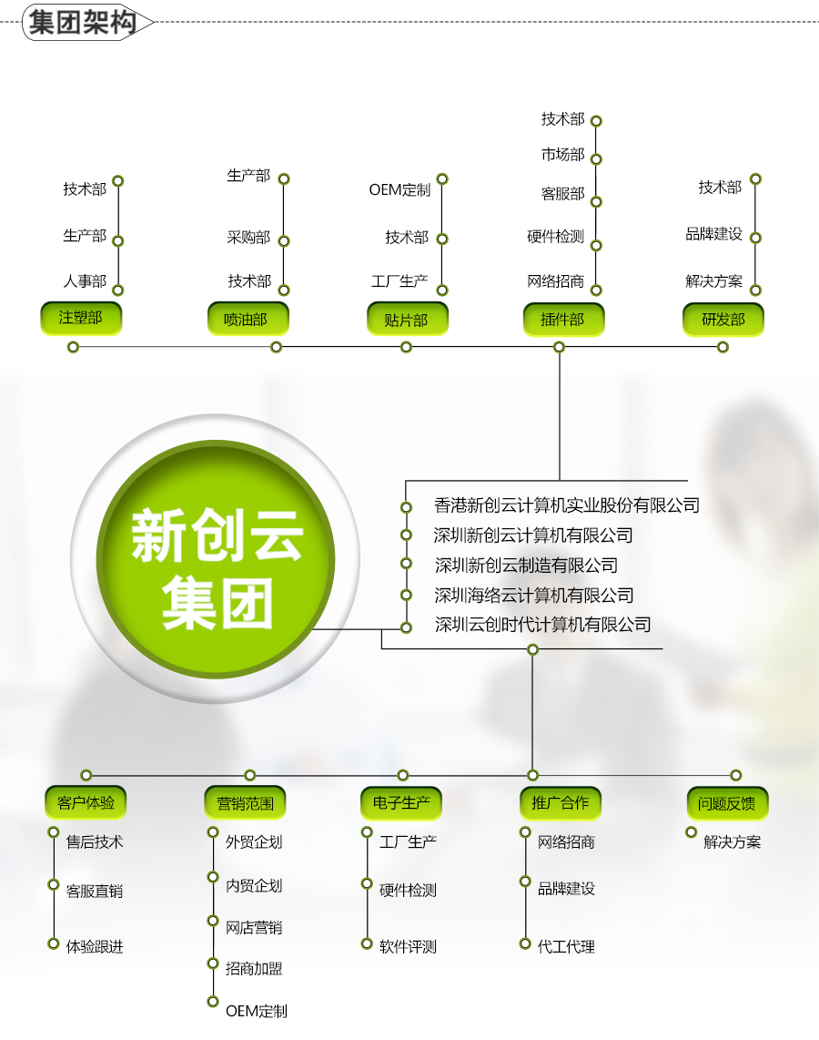 新创云集团自2003年成立之初,便以提供人人均可享用的高性能、便于管理维护、可普及的云电脑为宗旨。集团自成立之初便不断的研发新产品自最开始的脱机卡发展到如今的终端机 迷你电脑 云电脑已有40余款自主产品。现旗下已拥有5家子公司,分别为 香港新创云计算机实业股份有限公司、深圳新创云计算机有限公司、深圳新创云制造有限公司、深圳海络云计算机有限公司、深圳云创时代计算机有限公司。