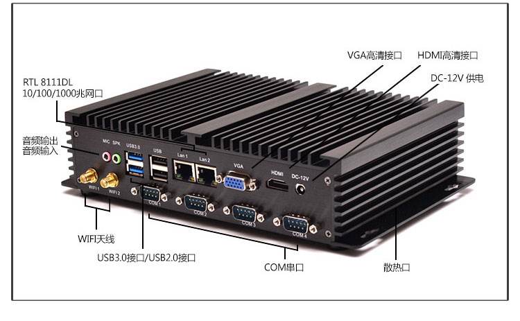 | 背部接口 | • 1 x DV12V DC电源输入 • 1 x VGA 接口 • 1 x HDMI 接口 • 4 x 串口 • 2 x USB 3.0 接口 • 2 x USB 2.0 接口 • 2 x RJ-45 1000M网络接头 • 2 x 音频接口 |