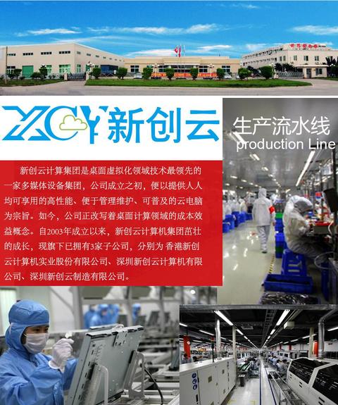 Hong Kong Innovative Cloud Computer Group is one of the leading Multimedia device conglomerate in desktop virtualization fields. Our company is a integrated high-tech enterprise which includes the research and development,production ,sales and trade. Since the founding date, The company is center on clients and adhere to the purpose quality win, reasonable price and transaction integrity,excellence".We devoted in providing high performance, maintainable ,sophisticated cloud computer. Today, the company is rewriting the concept of cost-effective desktop computing. Since the original off-line card machine ,we have been developed industrial tablet computer, terminals cloud, mini-computer in succession. Our company has more than 40 types of independent product.Since its inception in 2003, our company continued develop and grow into the industry model. Now Hong Kong Innovative Cloud Computer Group has five of its subsidiaries, namely the Hong Kong Innovative Cloud Computer Industrial Co., Ltd, Shenzhen Innovative Cloud Computer, Shenzhen Innovative Cloud Manufacturing Co., Ltd , Shenzhen Yun Chuang Age Computer Co., Ltd , Shenzhen Helor cloud computer Co., Ltd.